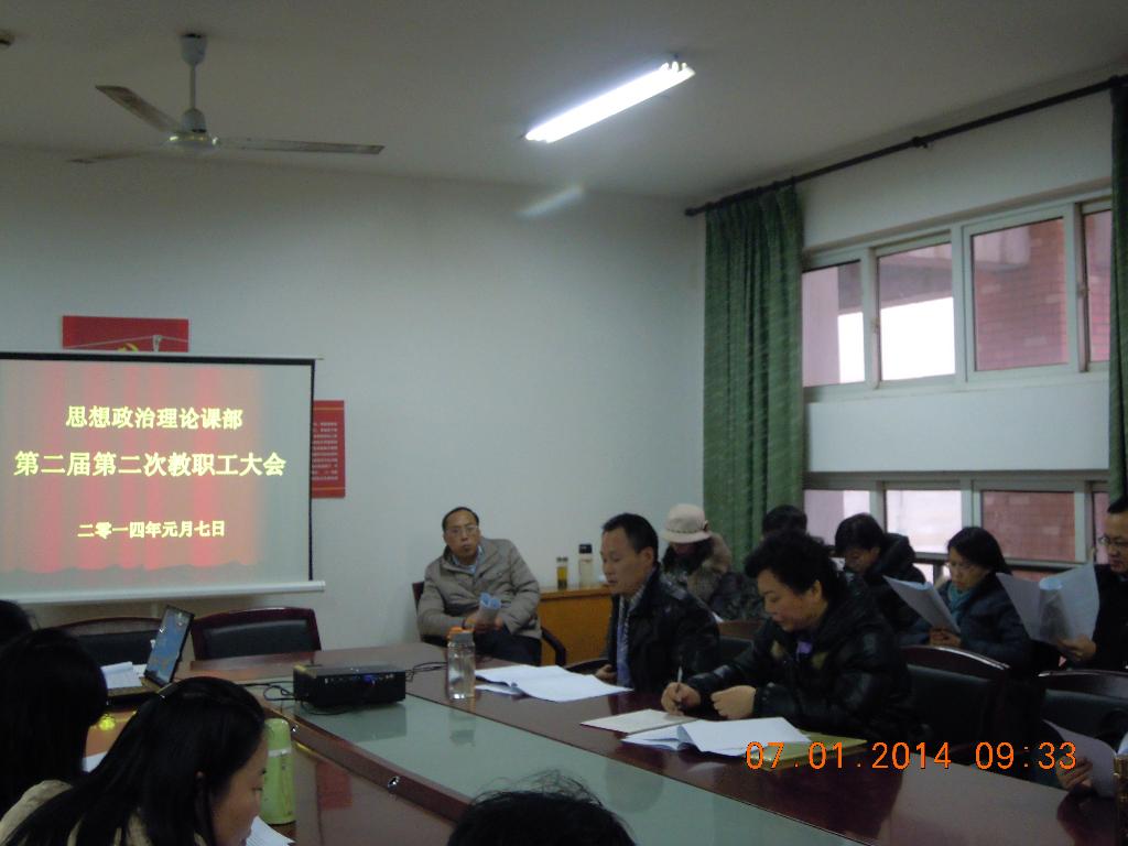 经过积极筹备,2014年元月7日上午,思想政治理论课部第二届第二次教职工大会在部门会议室召开。部门全体教职工参加了大会。