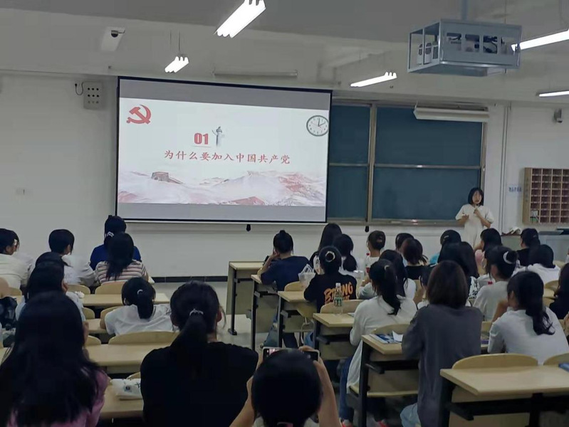 杜晓雯老师从党的百年发展历程、党的性质宗旨、如何端正入党动机等方面入手,鼓励在座新生认真学习党史和党的理论知识,积极争取早日成为合格的中国共产党员。她首先从国际国内形势及马克思主义在中国传播的历史条件展开,与大家一同回顾了党的创立过程,引导学生深刻感悟建党百年来取得的辉煌成就,深刻理解这些成就离不开一代又一代共产党员的努力与付出。她特别讲述了我校师生抗击疫情的感人故事,从身边优秀党员的鲜活事例中发出灵魂叩问——“为什么入党?入党怎么做?”,带领新生体会优秀党员们纯粹的入党初心,学习他们如何践行入党时的铮铮誓言,鼓励新同学端正入党动机,做时代的奋进者,做国家的守护者,做胸怀祖国人民的新时代有为青年,为实现“两个一百年”目标贡献自己的青春力量。