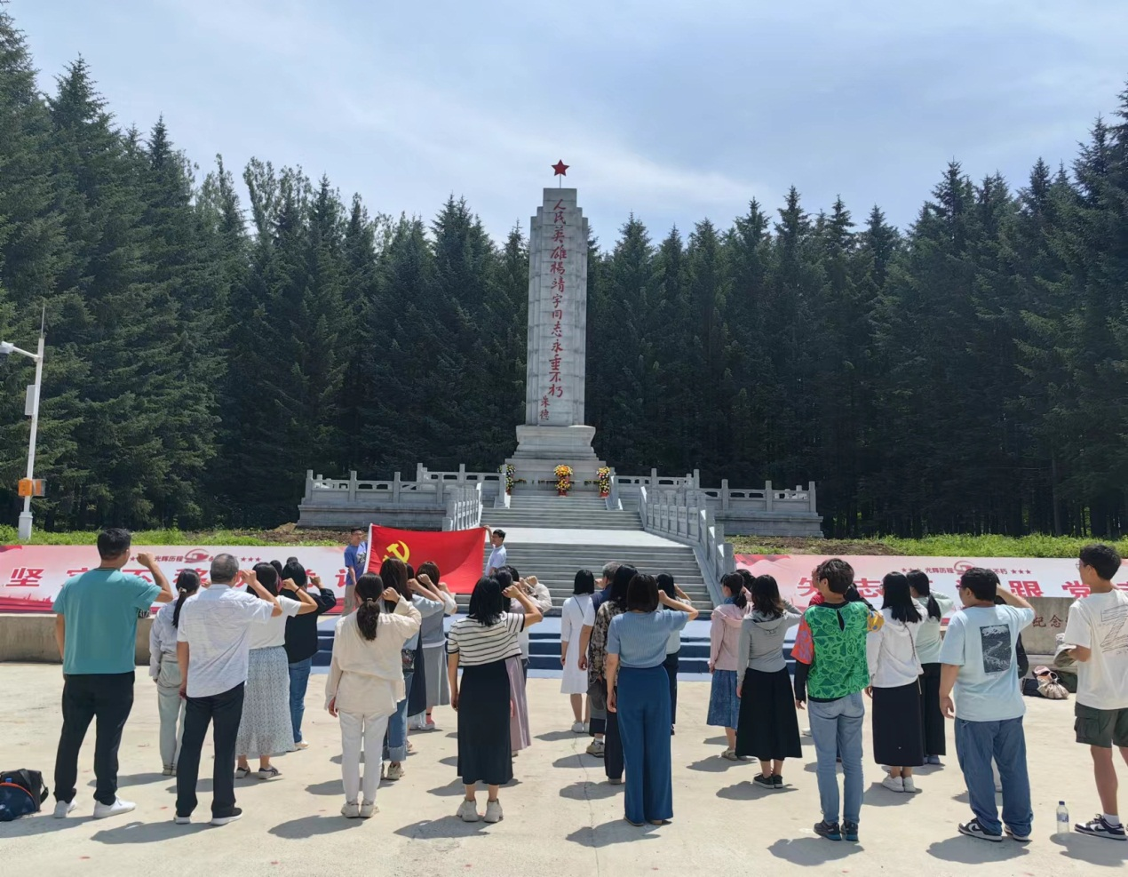 7月1日上午,全体学员来到了靖宇县,参观了杨靖宇将军纪念馆。在这里,学员们沉浸式学习了杨靖宇将军光辉而壮烈的一生,在他生前最后藏身的窝棚、在他牺牲的那颗大树下接受精神洗礼,在他的雕塑下重温了入党誓词,在场学员深受感染、无不动容。当天下午,学员们参观了四保临江战役纪念馆、四保临江烈士陵园,系统了解了东北解放战争时期我军“三下江南、四保临江”的战斗历程,并向先烈们敬献了花篮,表达了哀思。在陵园一角,讲解老师还指着一座特殊的墓碑,用质朴的语言、真挚的情感为大家讲述了“支前模范王大妈”——邢淑杰的故事,生动地再现了临江老区人民奋勇支前、参军参战的无私奉献精神。