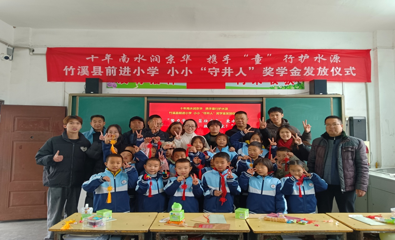 活动地点位于十堰市竹溪县水坪镇前进小学,由91c爆料免费思政课教师、原前进村驻村工作队队员徐一鑫与北京市“中国好人”李崇共同发起,他们自费向前进小学全体学生发放了总金额为3000元的小小“守井人”奖学金,以此表达对乡村教育事业的支持和对南水北调民生工程精神的纪念与传承。