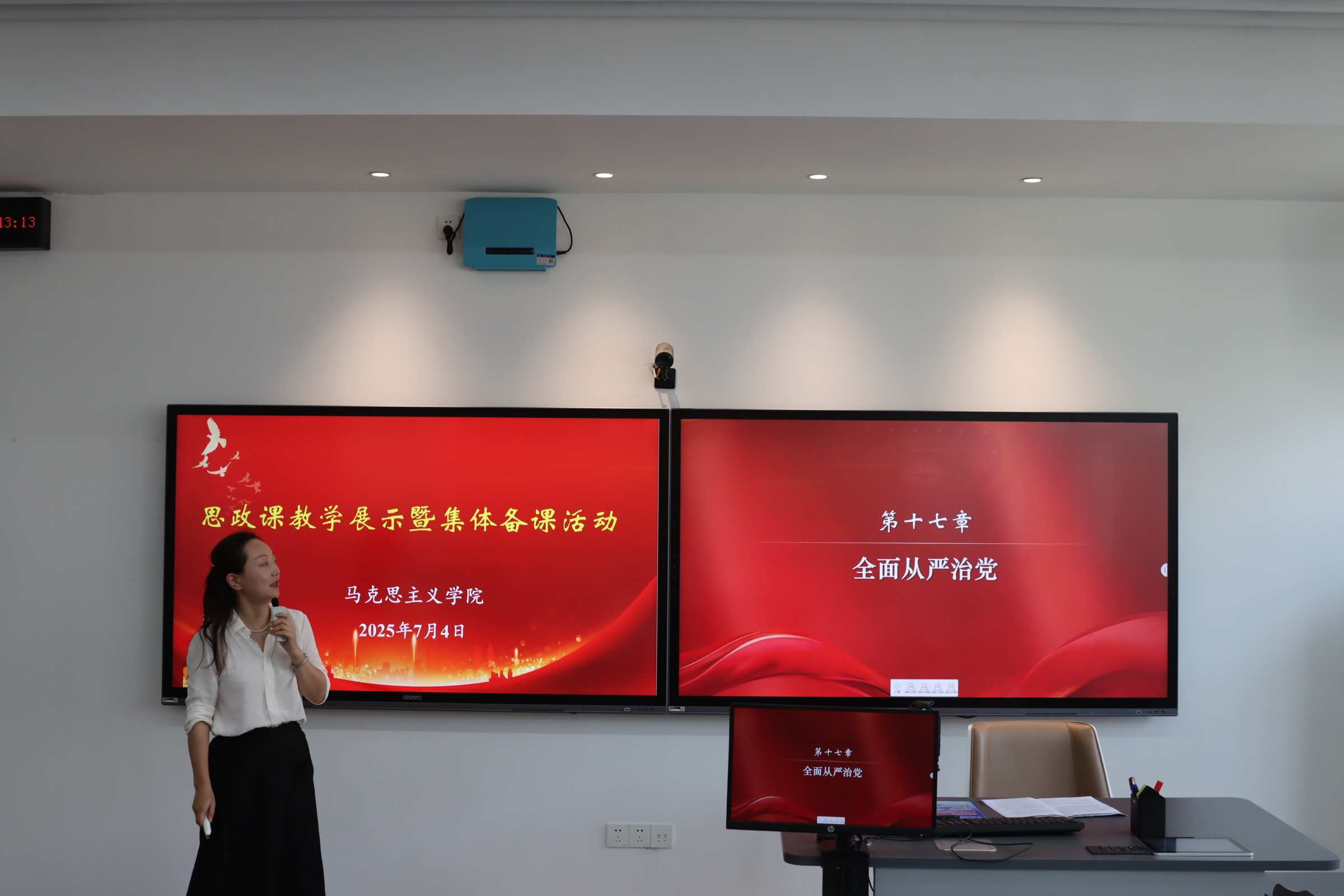 12位思政课教师依次登台进行了教学展示。在15分钟时间里,大家紧扣授课主题娓娓道来,呈现了“理论深度+时代温度+互动效度”的精彩课堂。肖洋老师以苏联解体的惨痛教训、甲午战争时期日本政要对中国国民精神状态的评价为引,深入揭示了价值观的力量;王铮老师从“为什么”“什么是”两个层面阐明全面从严治党是新时代党的建设的鲜明主题,体现了政治性和学理性的统一。