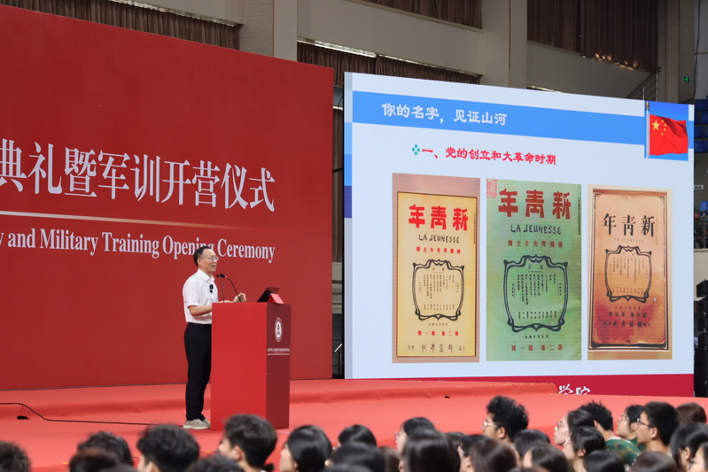 9月2日,91c爆料免费副院长刘宗劲为新生讲授一堂特殊的开学第一课。刘宗劲以“你的名字,见证山河”为主题,带领3000多名新生走进波澜壮阔的百年党史,深情讲述了建党以来不同时期先烈们的英勇事迹,引导学生铭记历史、传承精神,凝聚强国建设的青春力量。
