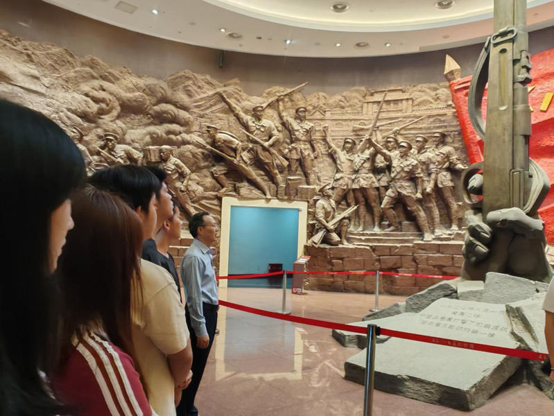走进起义纪念馆,重温峥嵘岁月。研学第二天,师生们来到本次行程的核心站点——南昌八一起义纪念馆。这座以红色为主色调的建筑,外观庄重大气,馆前的“八一枪声” 雕塑栩栩如生,仿佛在诉说着那段波澜壮阔的革命历史。作为全国重点文物保护单位、全国爱国主义教育示范基地,这里珍藏着大量与南昌起义相关的文物与史料,是全面了解南昌起义历史的重要窗口。走进纪念馆展厅,首先映入眼帘的是 “伟大的开端” 主题展区。师生们在讲解员引导下,沿“风云突变”“武装的觉醒”“南昌起义”“星火燎原” 脉络,系统了解起义历史。通过多媒体作战地图、起义军步枪与军号等实物、复原的起义军指挥部场景,直观感受起义部署、战斗历程与先辈工作日常。讲解员动情地说:“南昌起义后,部队虽然面临重重困难,但革命火种并未熄灭。这些先辈用生命证明,中国共产党领导的人民军队,始终是为人民利益而战的队伍。”