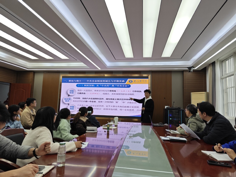 闻艺老师以“鉴往知来 砺行致远——从党的中央全会历程看党的二十届四中全会精神”为题,通过PPT演示,系统回顾了党的中央全会历程,特别是六届一中全会与党的二十届四中全会的对比分析,展现了全会精神的历史传承与时代创新。